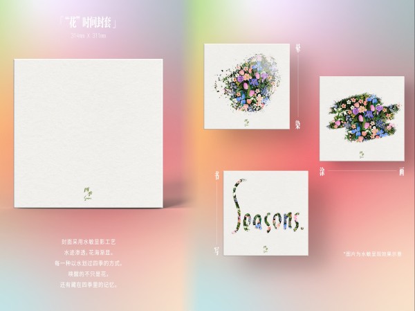 《四季Seasons》以季节更迭为叙事线索,在音乐中记录情绪的变化与陪伴的意义。专辑封套与小卡均采用水敏显影工艺制作:当水迹轻触表面时,隐藏的花海图案会逐渐显现;待水分自然挥发后,画面恢复原状。图案在显现与消散之间形成一次完整的变化过程,也呼应了专辑中关于时间流动与季节循环的主题。