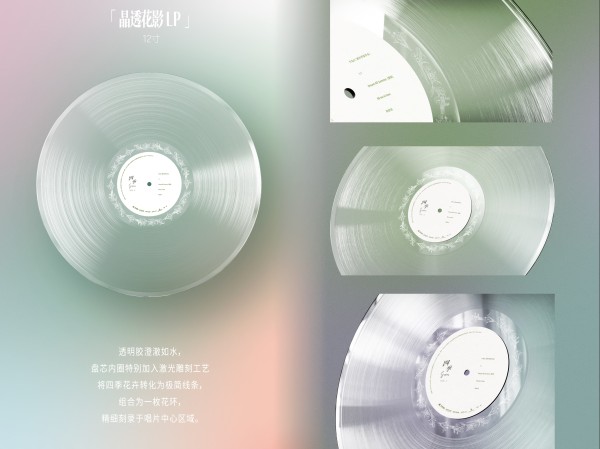 唱片采用高透透明胶材压制,整体呈现清澈、通透的视觉质感。盘芯内圈区域加入激光雕刻工艺,将春、夏、秋、冬具有代表性的花卉转化为极简线条,并组合为一枚花环结构,精细刻录于唱片中心位置。随着唱片旋转,雕刻线条在光线下呈现出层次变化,使音乐播放的过程同时形成可被观察的视觉效果。