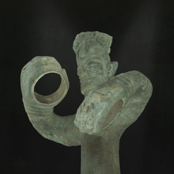 商铜立人像双臂抱握于胸前,双手巨大且呈环管状,但手中却空空如也。他原本握着什么?
