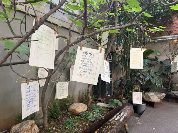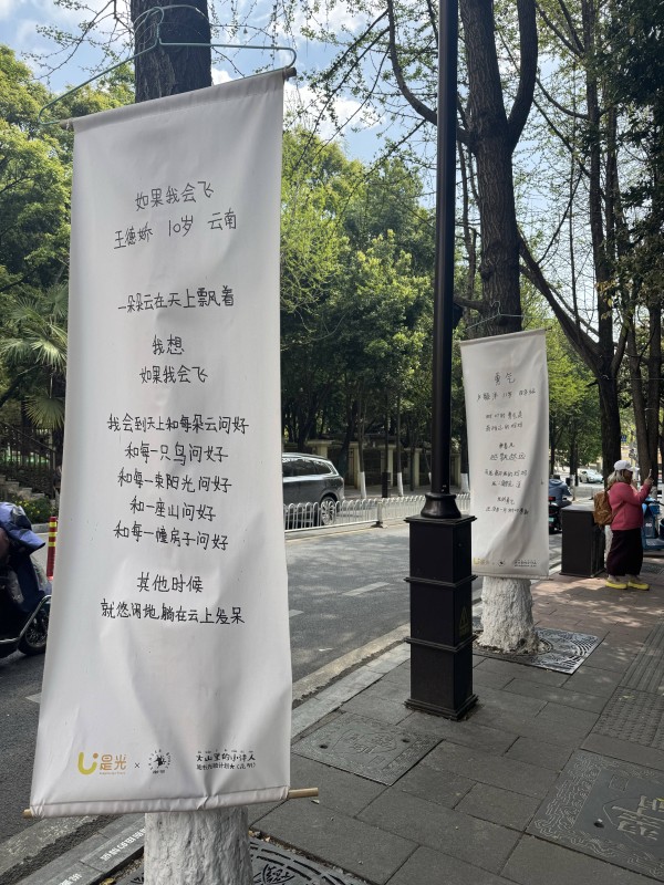 3月18日,记者来到翠湖北路上的橡皮书店,看到了这一方由稚嫩笔迹和诗歌组成的小天地。路边的大树上挂着两幅打印了诗歌的大型挂画,正对着橡皮书店的外部是一个小院落,院子里的矮树上,一幅幅手写短诗用衣架挂起,随风摇曳。记者在11点左右到达时,有不少市民在“诗歌小院”打卡拍照,仔细阅读。