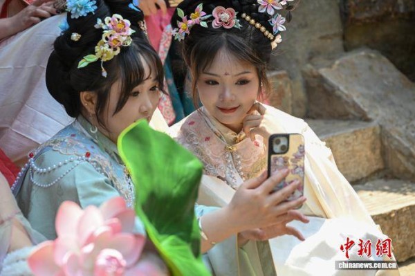 3月21日,云南昆明,两名女孩身穿传统服饰自拍。中新社记者 李嘉娴 摄