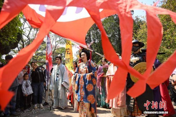 3月21日,云南昆明,汉服爱好者参与花朝节巡游活动。当日,昆明金殿名胜区举办花朝节主题活动,现场开展祭花神、汉服巡游、古风展演及民俗体验等内容,游客身着传统服饰游园赏花,尽享春城春日美好景致。中新社记者 李嘉娴 摄
