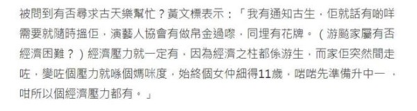 谈到跟游飚的难忘事,黄文标表示当年在TVB时游飚知道他要“劏车”,就提出借钱给他买车,因为担心对方要用钱时周转不来而婉拒好意,又大赞对方好有义气,有人出声就会帮忙。问到可知游飚有否借钱收不到,他坦言不清楚。谈到是否有找演艺人协会主席古天乐帮忙,他表示有通知古天乐,对方指有需要就出声,演艺人协会也有做帛金。