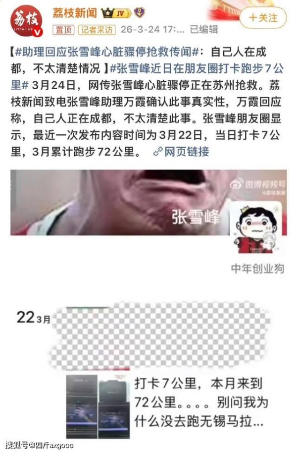 张雪峰的朋友圈最新停留在 3 月 22 日,当天他打卡跑步 7 公里,3 月累计跑了 72 公里,两天前还在坚持运动,状态看着并不差。