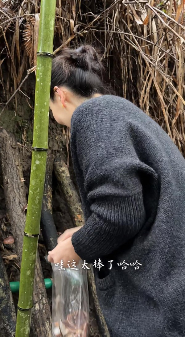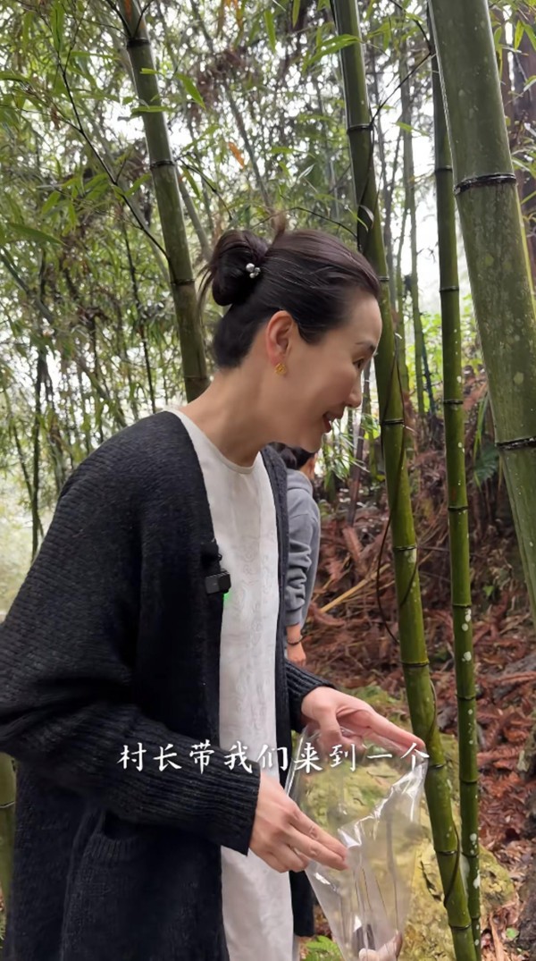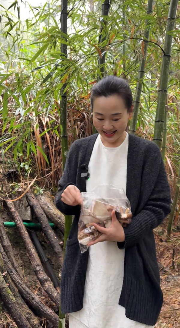 没一会儿就采了不少蘑菇的西华,她一手高举着刚采摘的褐色蘑菇,另一手托着装满菌菇的透明塑料袋,动作自然生动,热情地与网友们分享丰收的喜悦。背景是郁郁葱葱的竹林,更衬托出她身处自然中的恬静与活力,整个人散发着一种亲近自然、热爱生活的气息。