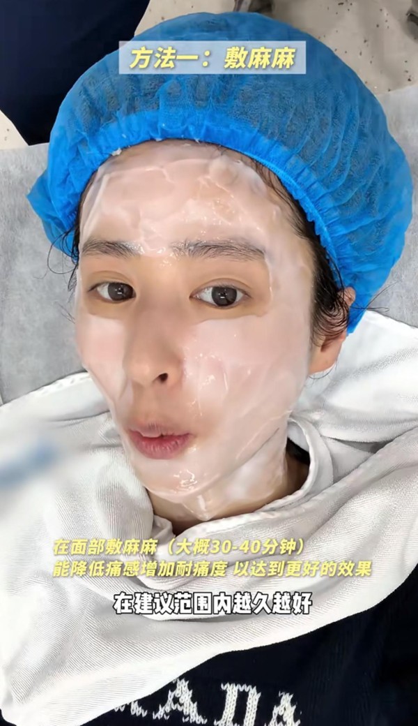 即便颖儿做了不少减少疼痛的准备,不过,在做热玛吉过程中,颖儿还是疼得失去表情管理。下图中,躺在床上的颖儿神情显得非常痛苦和紧张,她双眼紧闭,眉头紧锁,面部肌肉因疼痛而扭曲,难以忍受疼痛的她时不时还发出呼喊。
