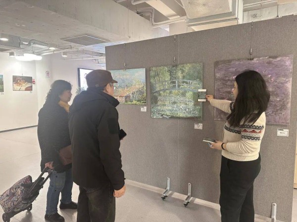 二楼“艺汇凌云”展厅里,《睡莲》的朦胧紫绿晕染出水面的波光,《春天的花》以浓艳的笔触勾勒出春日盛放的生机,《船上画室中的莫奈》则定格了塞纳河畔的创作瞬间。社区居民们凑近端详,艺术的温度在烟火气里慢慢流淌。
