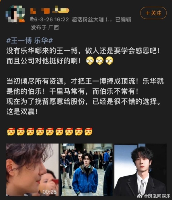 关于其股权激励以及合约是否到期的消息,部分网友表示续约是双赢的局面;但也有王一博粉丝表示反对和乐华娱乐续约,表示公司给出的股份奖励无法匹配王一博为公司做出的贡献。