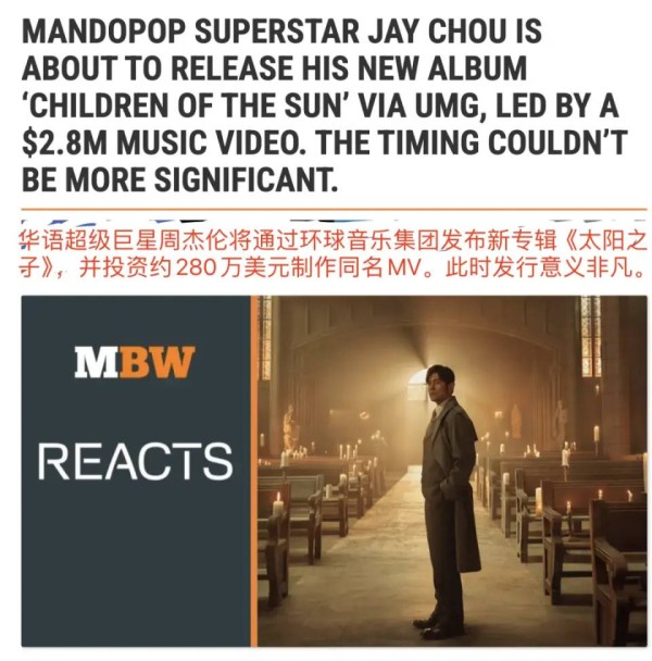 在爆发之外,《太阳之子》还刻意强化了一种几乎已经消失的传统发布仪式。MV上线、发布会与媒体沟通的回归,使专辑发布重新具备公共事件的属性,而不仅是平台上的一次内容更新。不但环球音乐高层赞赏他的影响力,MBW等海外行业媒体也发文,称他为华语乐坛巨星(Mandopop superstar),称这张专辑的发行在更广泛的全球录制音乐市场下具有重要意义。