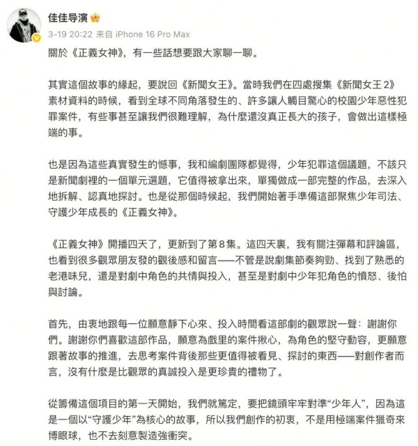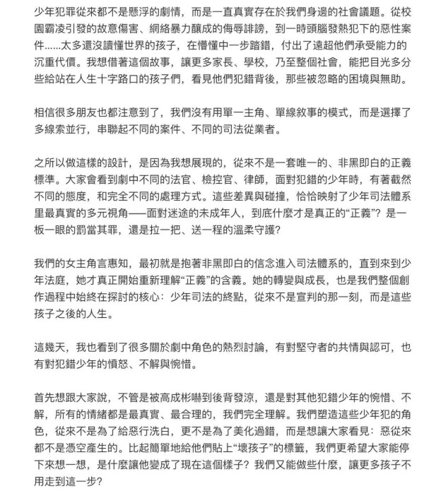 正因为设定鲜明,所以当内地率先播出后,不少人自然联想到韩剧《少年法庭》,甚至直接质疑“抄袭”。面对这类声音,总监制钟澍佳没有回避,反而罕有在社交媒体发长文,详细讲了《正义女神》的创作起点,也算是正面回应了争议。