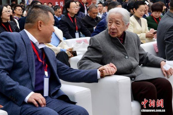 3月26日,常沙娜(右)和与会嘉宾交谈。中新社记者 钱晨菲 摄