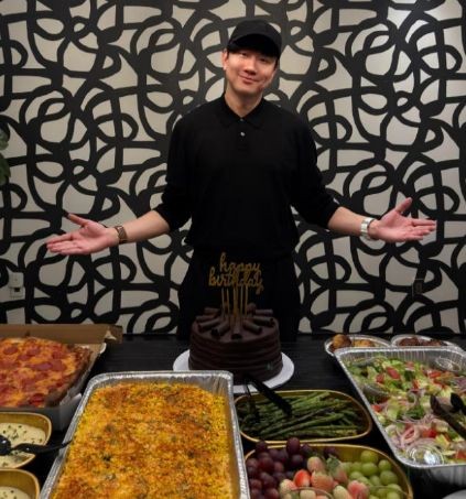 他站在摆满装饰的餐桌旁,双手张开,笑着展示大家为他准备的生日蛋糕,大合照里,团队的工作人员围在他身边,个个都对着镜头笑意盈盈,现场氛围热闹又温馨。