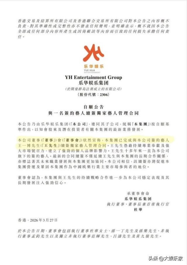而在3月27号这天,乐华发布公告称,公司已与王一博续签独家艺人管理合同,确认真的续约了!