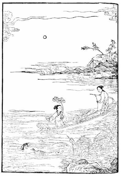顾况《溪上》:“采莲溪上女,舟小怯摇风。惊起鸳鸯宿,水云撩乱红。”