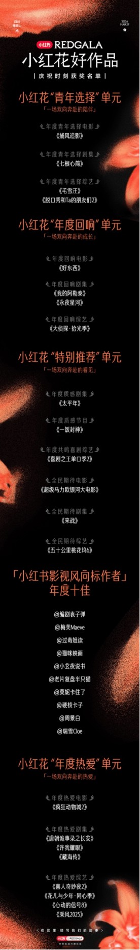本次在“小红花好作品庆祝时刻”上,共设置“小红花青年选择”、“小红花年度回响”、“小红花年度热爱”以及“小红花特别推荐”四大单元、22个作品奖项,以及年度十佳“小红书影视风向标作者”。