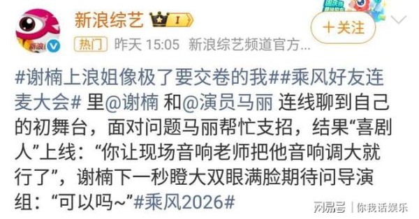 在春暖花开的季节,观众们观看《乘风2026》综艺,也是一种美好的期待!乘风2026写道:“当她们拨通好友的电话,屏幕那头的牵挂与鼓励,都化作了直面挑战的勇气。”清晰可见的是,谢楠连麦马丽!