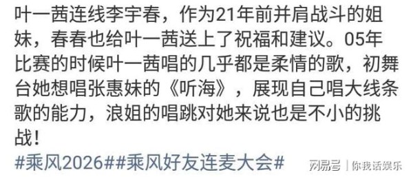 那么,叶一茜即将登台的演出,也就令人非常期待!“乘风好友连麦大会”也就感动你我他!要知道,连麦的双方都是引人关注的!一方面,连麦的这一方,是参加《乘风2026》初舞台的选手!