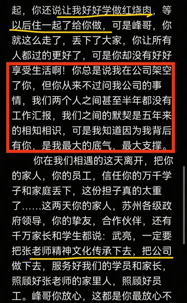 “这几天,你的挚友、合作伙伴,还有万千家长和学生都说:武亮,你要把张雪峰老师的精神传承下去,把公司做下去,服务好学员和家长。”