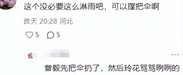 纠结了三秒钟,玲花咬咬牙也把伞扔了出去,那模样活像是被损友拉着干坏事,自己不情愿但还是认了,反差感直接拉满。没了雨伞遮挡,暴雨没一会儿就把俩人浇成了落汤鸡,玲花的头发衣服全都贴在身上,脸上的精致妆容也被雨水冲花,眼线眼影全晕开,雨水顺着脸颊往下淌。这一幕被现场观众拍下来发到网上,评论区直接笑疯了,全在说曾毅现在越来越敢带偏玲花了。