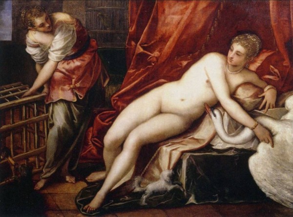 其中,丁托列托的《丽达与天鹅》是16世纪威尼斯画派的代表作之一,描绘了宙斯化作天鹅与斯巴达王后丽达相会的希腊神话场景,画面充满戏剧性光影与张力。这幅作品以强烈的明暗对比和动态构图著称,人物被置于室内空间,背景是深邃的暗红色帷幔,凸显出丽达柔润的肌肤与丝绸织物的光泽质感。丁托列托融合了提香的色彩运用与米开朗基罗的形体表现力,塑造出健硕而优雅的人体,同时通过飞扬的布料与缠绕的姿态增强画面的情感冲击。
