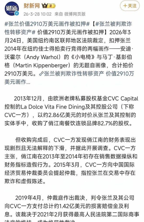 这件事得从俏江南易主开始说起。2013年,张兰将手中82.7%的俏江南股权卖给了欧洲的私募机构CVC,交易价格高达2.86亿美元。到了2014年,张兰还拍下了两幅名画,谁能想到,这两幅画后来竟成了她的麻烦源头。新的股东接手后,很快发现了俏江南的财务数据出现了严重问题,和之前提供的财务报告完全对不上。经过调查,最终查出了公司存在销售造假、财务指标造假的问题,证明张兰当时交出的财务报表本身就有不实之处。更为严重的是,这两幅名画也因此被依法扣押。两幅画的价值高达2910万美元,其中一幅是安迪·沃霍尔的《小电椅》,另一幅是马丁·基彭伯格的无题自画像。