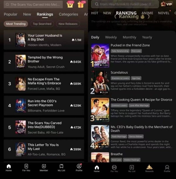 我们观察了DramaBox、ReelShort英文版本的热门短剧排行榜单,目前高热项目还是集中于契约婚姻、身份反转、豪门继承、复仇逆袭等高转化题材。不过在这个基础上,现在许多高热项目也融入了狼人、校园、师生等更贴近欧美用户语境的设定。