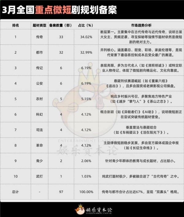 根据本月备案数据统计,3月全国重点微短剧规划备案共计97部。从题材占比来看,市场依然呈现出高度集中的头部效应:
