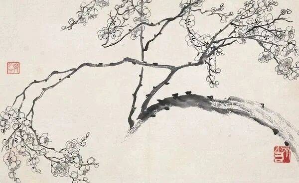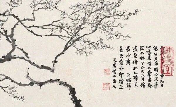 齐白石早年(约30岁前后)遍临明清名家,金农是其重点学习的对象之一。他对金农画梅的渴笔焦墨技法、以书入画的线条刻意摹仿——金农画梅喜用硬毫枯笔,线条凝练如篆籀,枝干多作斜欹之势,花瓣简淡疏落,齐白石早期梅花作品中,枝干的苍劲顿挫、花瓣的简约留白,都能看到金农的影子。