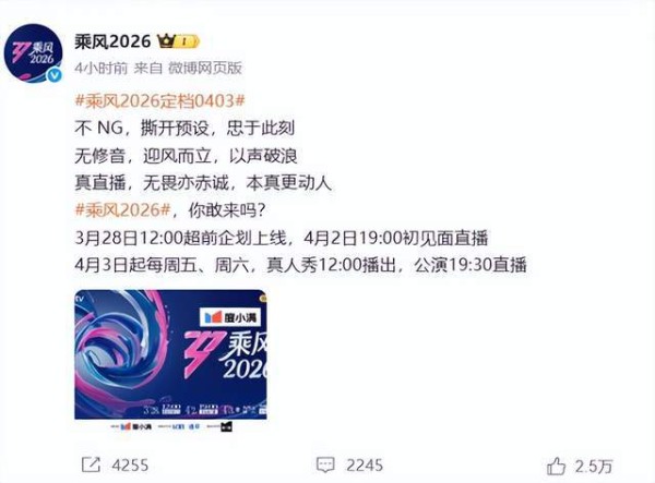 浪姐7《乘风2026》定档4月3日,32位姐姐真唱真跳全程直播