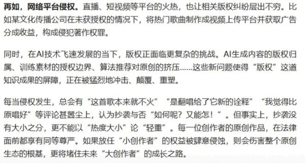 随着事件不断升级发酵,官媒人民日报都坐不住了,发文突出强调了行业版权问题,尤其对滥用AI技术做出明确表态。