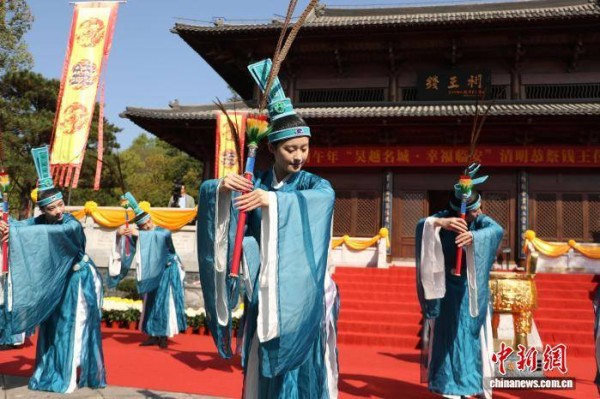4月2日,在清明恭祭钱王仪式上,表演者以乐舞敬拜钱王。当日,丙午年清明恭祭钱王仪式在浙江杭州临安举行,近500名海内外钱氏后裔齐聚于此,共祭先祖武肃王钱镠。中新社记者 吴怡欣 摄