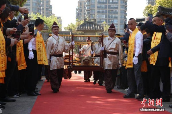 4月2日,在清明恭祭钱王仪式上,工作人员抬着供品敬奉钱王。当日,丙午年清明恭祭钱王仪式在浙江杭州临安举行,近500名海内外钱氏后裔齐聚于此,共祭先祖武肃王钱镠。中新社记者 吴怡欣 摄