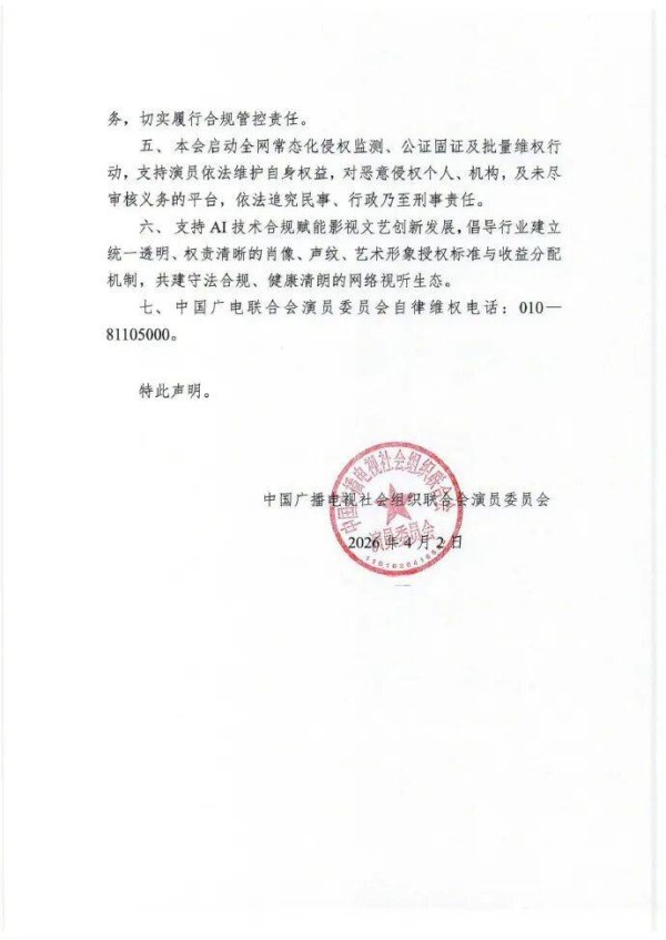 针对AI换脸合成、声纹克隆复刻、影视素材任意篡改、魔改、擅自抓取演员影像声频用于AI模型训练等侵权行为频发,中国广播电视社会组织联合会演员委员会发布声明,支持演员依法维护自身权益,对恶意侵权个人、机构,及未尽审核义务的平台,依法追究民事、行政乃至刑事责任。
