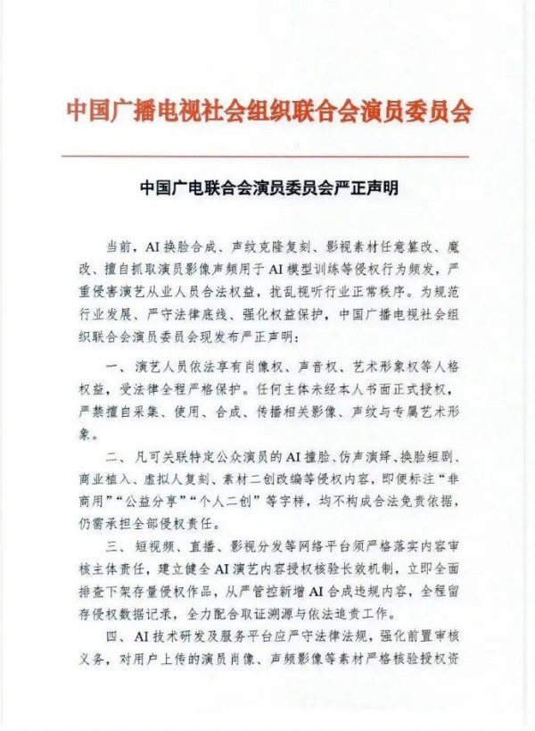 中国广电联合会演员委员会就AI侵权发声明