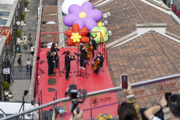 4月4日,第41届“上海之春”文艺轻骑兵惠民行虹口专场首场演出在“滨港商业中心今潮8弄”启幕。俄罗斯莫斯科国立柴可夫斯基音乐学院独奏家室内乐团来到百年弄堂屋顶演奏,为市民呈现沉浸式艺术盛宴。