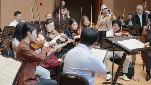 廖昌永唱得很投入,旁边的师生乐团屏息凝神,跟着指挥张橹的手势起落。排练到《我和我的祖国》时,女高音顾文梦、乌列热,男中音张曦、张功浩加入合唱,在这个温馨的小空间里,音乐让所有人联结在了一起。