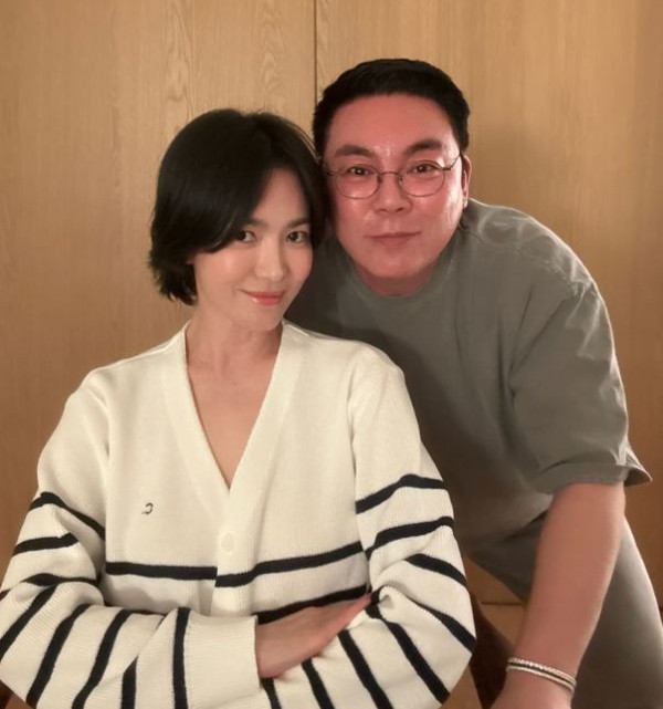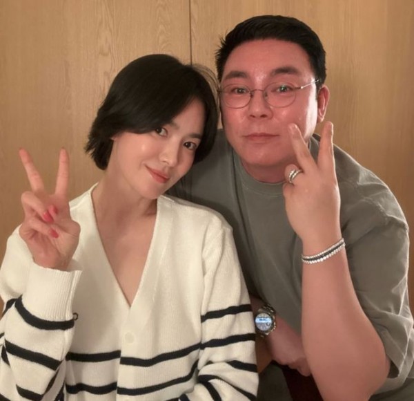 照片中的宋慧乔坐在椅子上,好友站在她的身后,俯下身跟她一起拍照,两人对着镜头比耶拍照,看起来心情很不错的样子。有粉丝注意到,比起之前,宋慧乔的头发似乎又长长了一些。