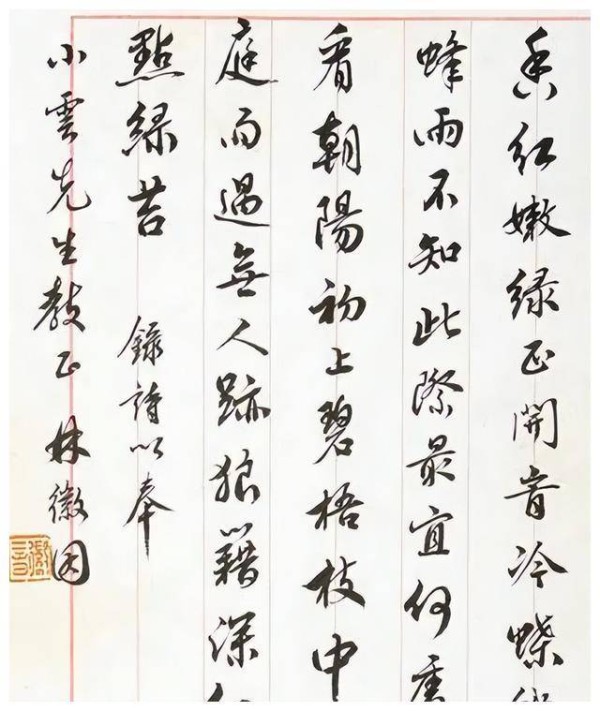 林徽因的楷书还融入了行、隶笔意。横画收尾常用顿笔回收,笔画自然连带,呈现褚楷典型特征。结字方面,她讲究外圆内方,四面舒展,字内空间宽敞通达,转折处方圆兼用,切笔分明,显露出字里行间的灵动与均衡。
