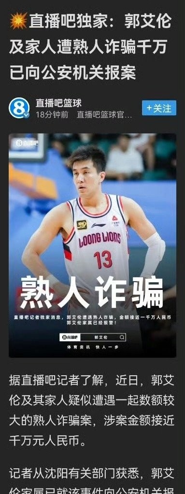 #郭艾伦被诈骗近千万#天啊?郭艾伦遇到熟人诈骗1000万有网友总结出郭艾伦一年能赚个5000多万,然后被骗了大概年收入的百分之二十。天啊?所以所以说防诈骗意识要加强,对熟人也要有防范意识!
