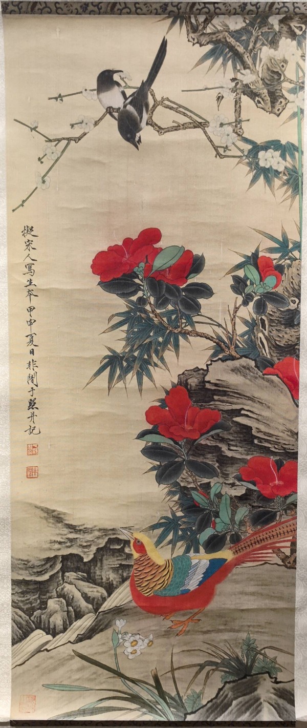 画面中的喜鹊与七彩凤凰鸡是整幅作品的点睛之笔,汪骏成点评道,这两类物象的造型比例精准无误,形态生动传神,尽显“生动之气”,将自然生灵的灵动与生机展现得淋漓尽致,让整幅作品充满生命力。这种精准的造型能力,源于于非闇先生对生活的细致观察与深入写生,他曾说“生活是创作的泉源”,这份对自然的敬畏与对细节的追求,正是其作品能够打动人心的关键。这幅于非闇花鸟真迹,不仅集中展现了先生的笔墨精髓与艺术风格,更承载了近现代工笔重彩花鸟画的传承与创新脉络,其艺术研究价值、收藏价值突出,既是研究于非闇艺术成就的重要范本,也是学习传统工笔花鸟画技法的优质资料。