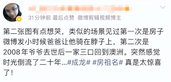 还有网友晒出房祖名早年发布的童年旧照,照片里年幼的房祖名骑在成龙的脖子上,笑得天真烂漫,而成龙也一脸温柔地托着儿子,满满都是父爱。如今再看惠州同游的合影,时光仿佛猛然倒流二十年,当年的小男孩已然长成中年男人,而曾经意气风发的父亲,也添了几分岁月的温柔。