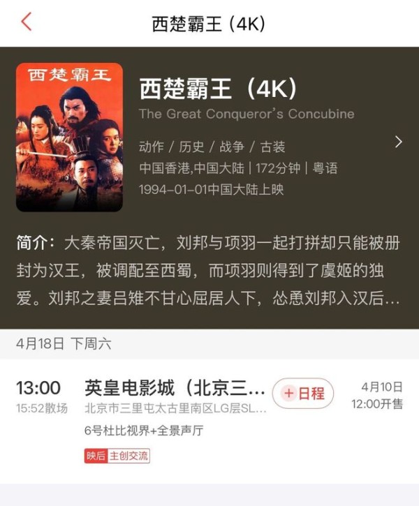 4.18 三里屯英皇 《西楚霸王》170分钟完整版。对谈导演冼杞然先生,仅有一场授权,不要错过!