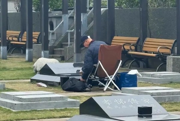 一把折叠椅,一把遮阳伞,手里抱着平板,每次来他都拿着鲜花、饮料,就这样一坐就是一整天,离开时还不忘亲吻爱妻墓碑。
