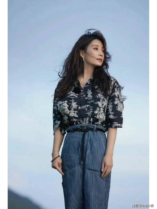 这件印花衬衫搭配阔腿裤的造型也很松弛,殷桃选择的黑底底色搭配白色植物纹样,摒弃了大红大绿的花哨印花,走的是低调复古的路线,保留了春日的灵动气息,又不会显得甜腻浮夸,适配40+女性的气质。版型上采用宽松落肩设计,微微松弛的剪裁弱化了肩部线条,对肩宽、溜肩的中年女性格外友好,不会像修身衬衫那样暴露身材短板。