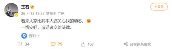 4月12号 19:23分,王石发微博“看来大家比我本人还关心我的动态。一切安好,造谣者交给法律。”