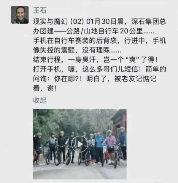 他还发布朋友圈:“现实与魔幻(02)01月30日晨,深石集团总办团建——公路/山地自行车20公里⋯⋯手机在自行车赛装的后背袋,行进中,手机像失控的震颤,没有理睬⋯⋯结束行程,一身臭汗,岂一个‘爽’了得!打开手机,喔,这么多哥们儿短信!简单的问询:你在哪?!明白了,被老友记惦记着,谢!”
