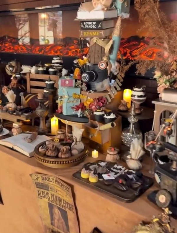 这次生日派对走的是哈利波特魔法风,现场布置全是主办方的小心思。到处都是和魔法IP相关的装饰,专门设了主题甜品桌,连《哈利波特》里经典的9又四分之三月台都还原了,氛围感直接拉满。光是蛋糕主办方就准备了至少三个,每一个都有不一样的巧思。