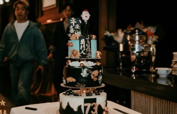 主蛋糕足足有三层高,最顶层放了曾志伟的卡通公仔,还写着“平安喜乐”“奖门人生日快乐”的字样。中间层是大气的黑金配色,最底层特意标了大大的73数字,细节里全是诚意。另外两个蛋糕一个是哈利波特城堡造型,一个是传统的圆形蛋糕,摆在一起拍合照特别有排场。