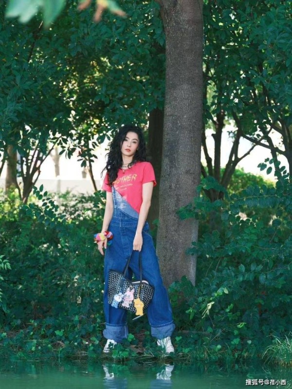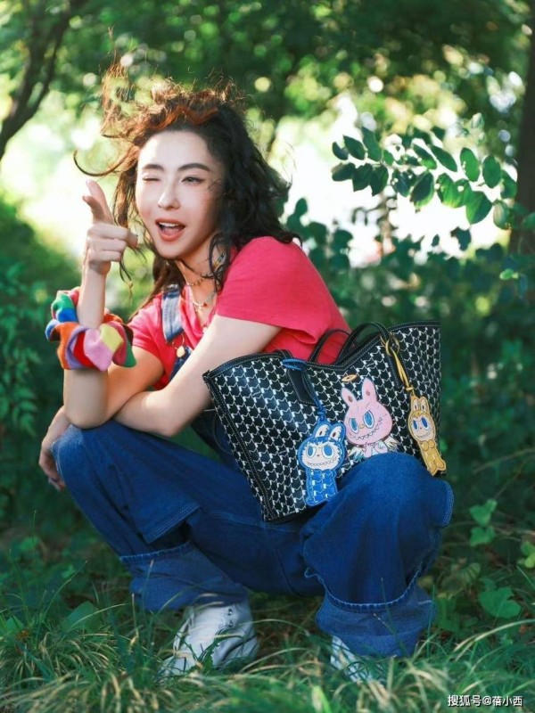 背带裤的穿法不单一,张柏芝将一边的肩带搭在肩膀上,另一边肩膀则没有出现裤子肩带,我们在胸部可以看到背带裤的里子外翻,尽显层次感。包的颜色以黑色为主,包身有白色图案点缀其上,关键是图案的排列蛮整齐,十分养眼。包的上面挂了好几个彩色的小玩偶挂件,有粉的蓝的黄的,一下子让整个穿搭多了点俏皮感。