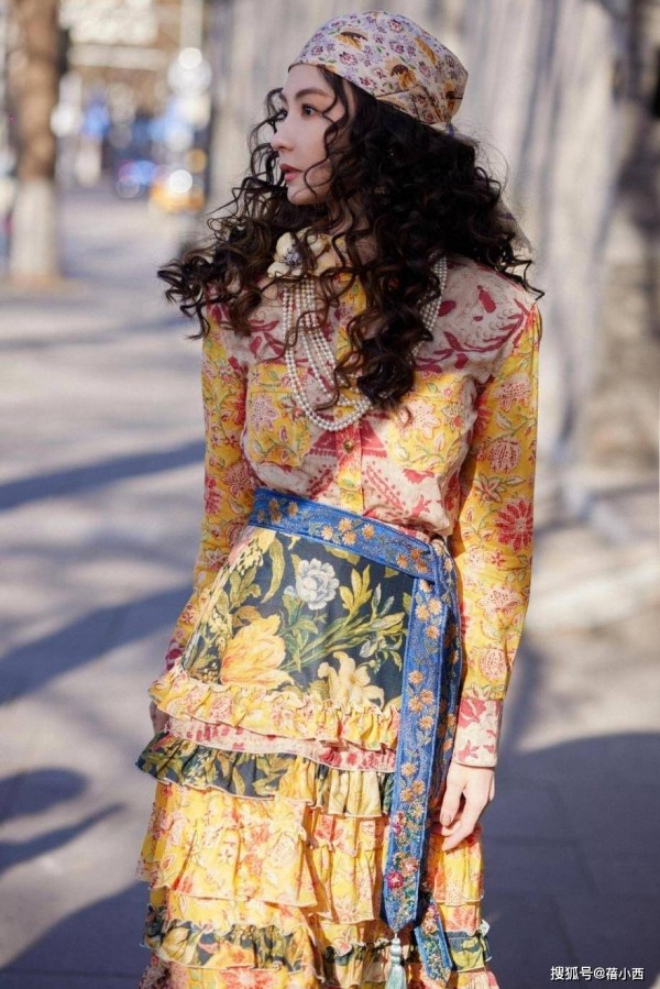 头上戴着一款头巾,花纹细碎又温柔,和所穿衣服风格完全呼应。身上是一套黄调的印花套装,上衣是衬衫款,底色偏暖黄,印着红粉相间的复古花案。下半身是层层叠叠的蛋糕裙,每一层都带着荷叶边,走路的时候看着软乎乎的。